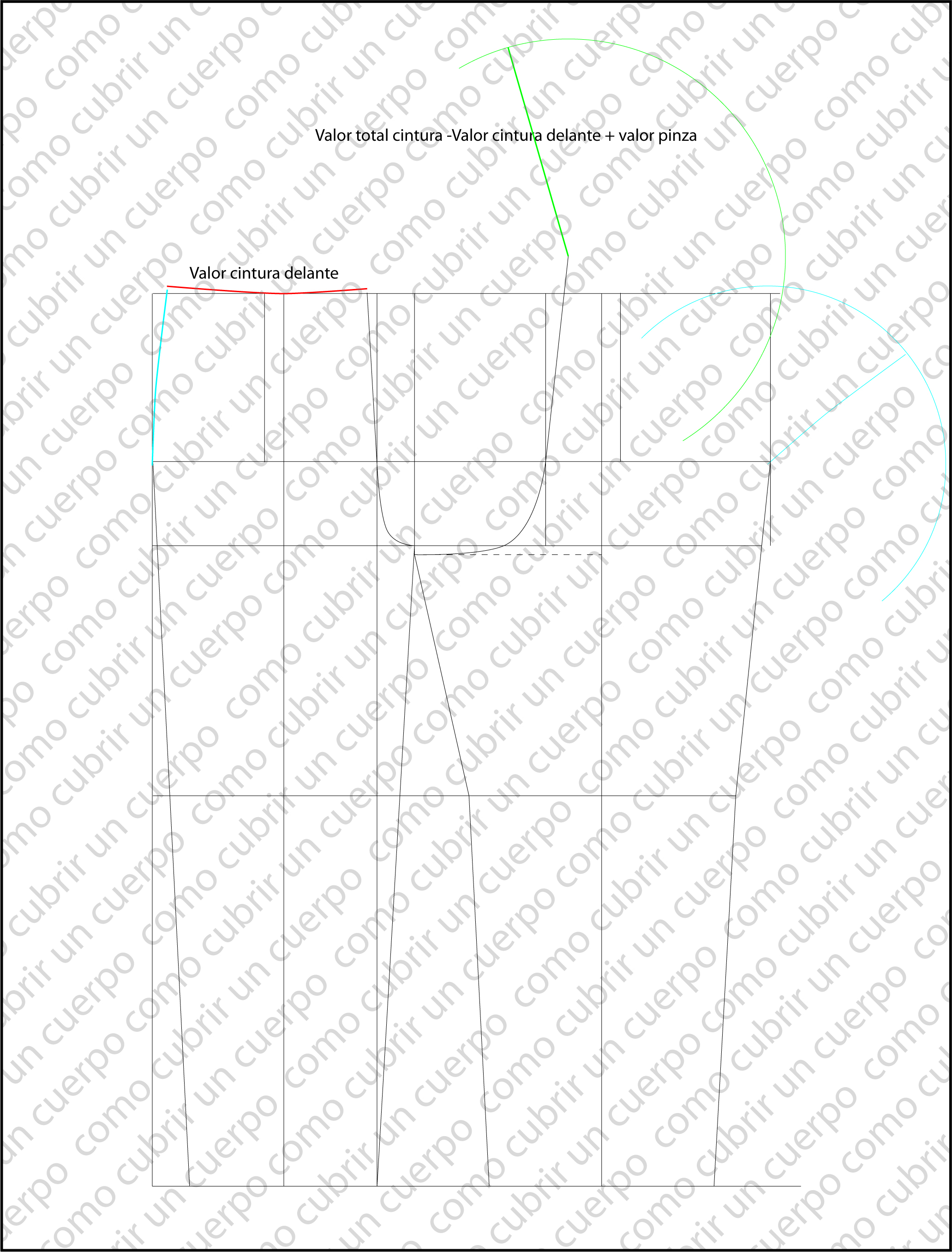 A partir de este punto trazaremos un arco cuyo radio sea igual a la medida total de cintura menos el valor de la cintura delante más el valor de la pinza de detrás que hemos determinado más arriba (radio evidenciado de color verde).